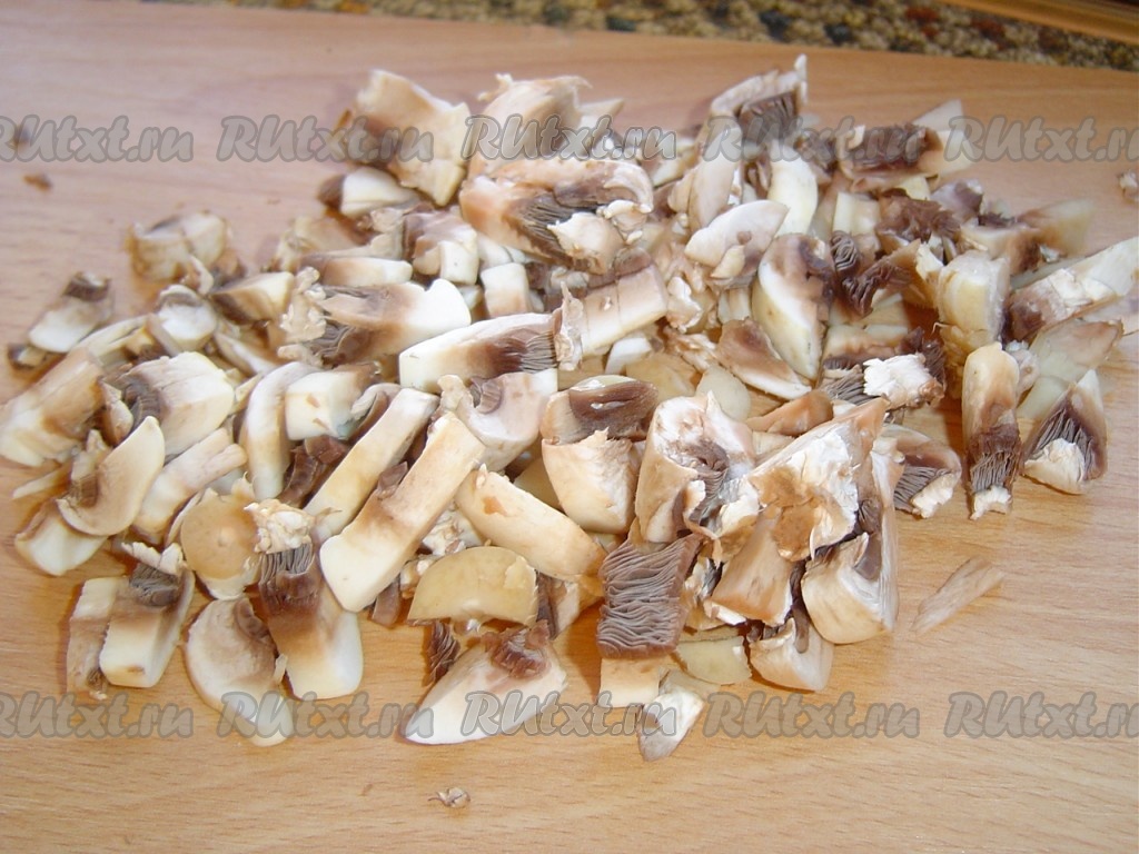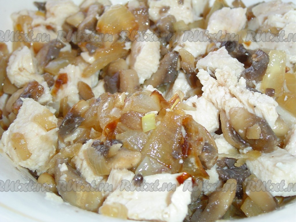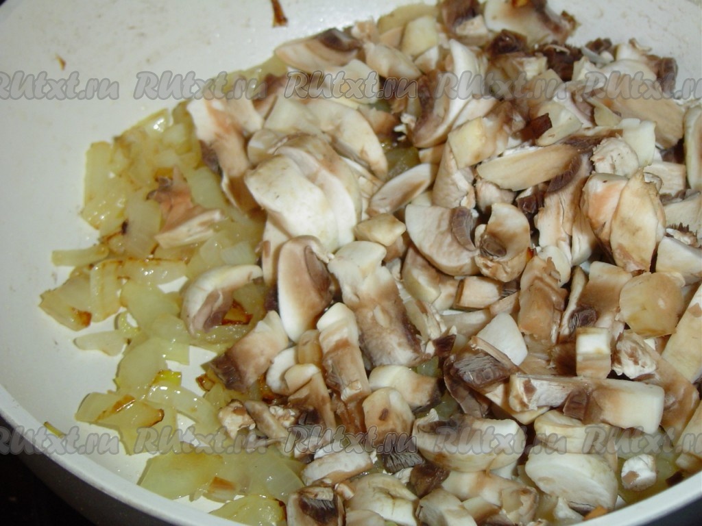 На растительном масле обжариваем лук до золотистого цвета, а затем добавляем грибы и тушим минут 10.