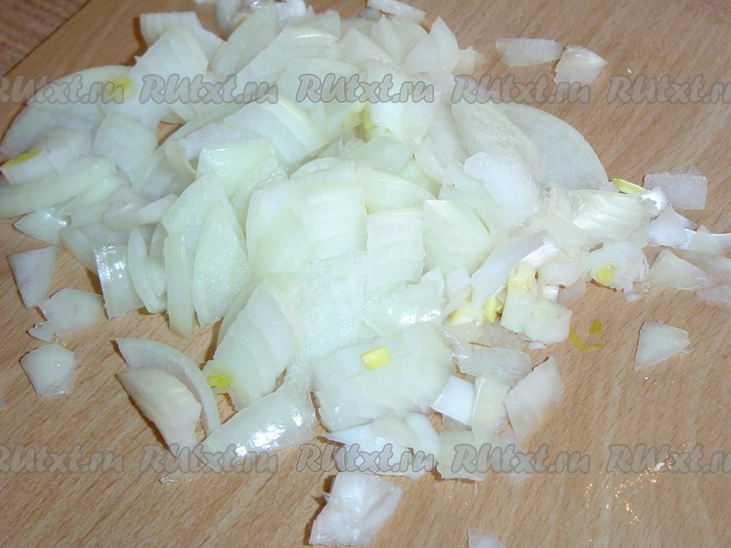 Начинаем процесс с приготовления начинки, для этого очищаем лук и нарезаем кубиками,