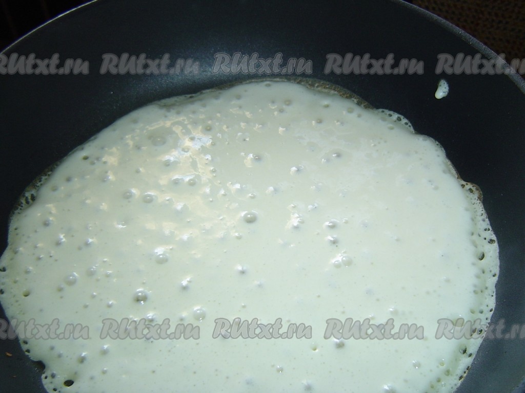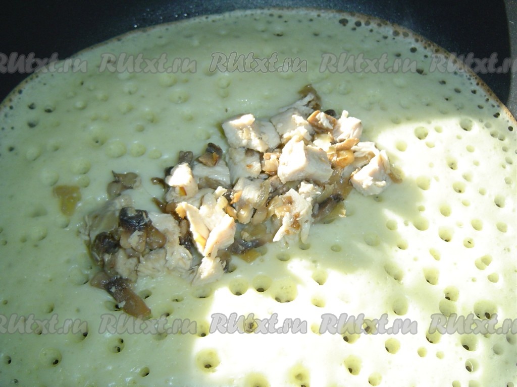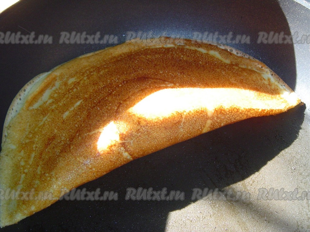 Как только края начнут поджариваться, на середину блинчика кладем начинку