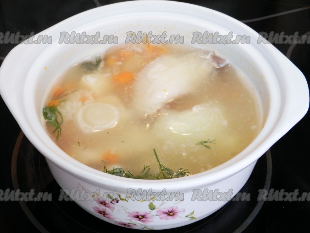 Когда овощи и рис сварятся, вынуть из кастрюли лук, добавить рыбу, немного свежего укропа, черный молотый перец и варить суп еще 7 минут до готовности рыбы.