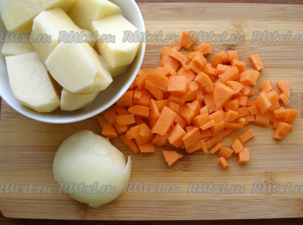 Картофель нарезать крупно, морковь нарезать кубиками.