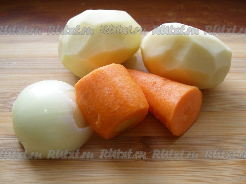 Лук, картофель и морковь вымыть и очистить.