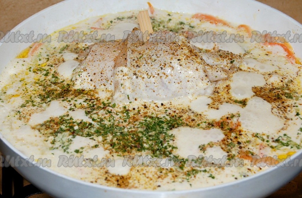 К получившемуся сливочному соусу добавить соль, перец и специи. Перемешать аккуратно и тушить камбалу под крышкой на среднем огне 10 минут.