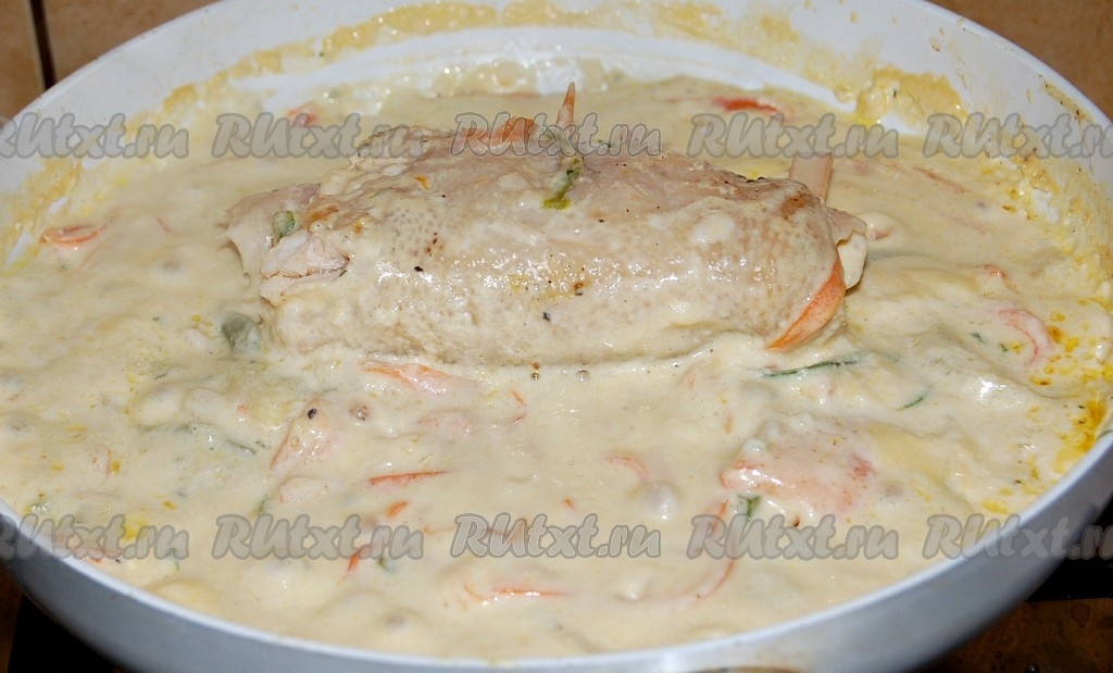 Добавить в сковороду сливки. Если у вас, как и у меня, сливки жирные, то можно влить горячую воду. Рулет должен быть покрыт соусом из сливок (или сливок и воды) до половины.