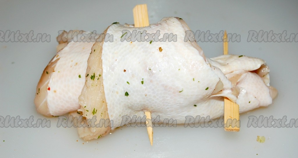 Свернуть филе рулетом, начиная с широкой части. Скрепить с помощью деревянных шпажек (или зубочисток).