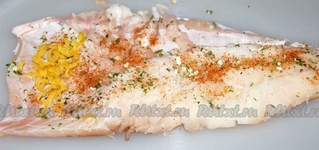 Филе камбалы помыть, обсушить. Посыпать солью и специями. Я ещё на широкую сторону выложила цедру лимона, но это по желанию.