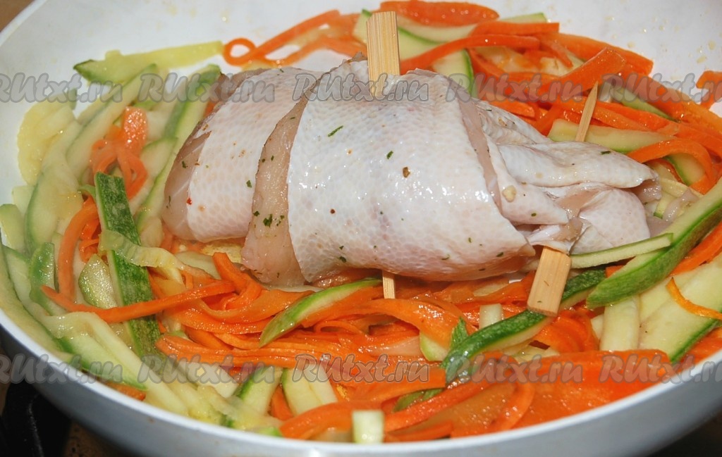 Сформированный рулет из камбалы выложить в сковороду к овощам.