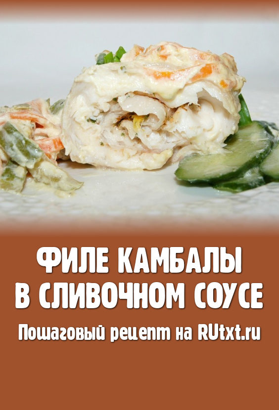 Переложить сочное, нежнейшее филе камбалы из сковороды на тарелку, вынуть деревянные шпажки, острым ножом нарезать на порционные кусочки и подавать к столу вместе со сливочным соусом и тушёными овощами. Также при подаче в тарелку можно добавить немного зелени и свежих овощей.