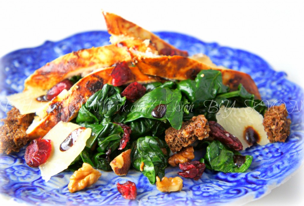 Переложить шпинат в сервировочные тарелки, добавить нарезанное куриную грудку, клюкву, сыр, сухарики и заправить салат соусом бальзамик.
