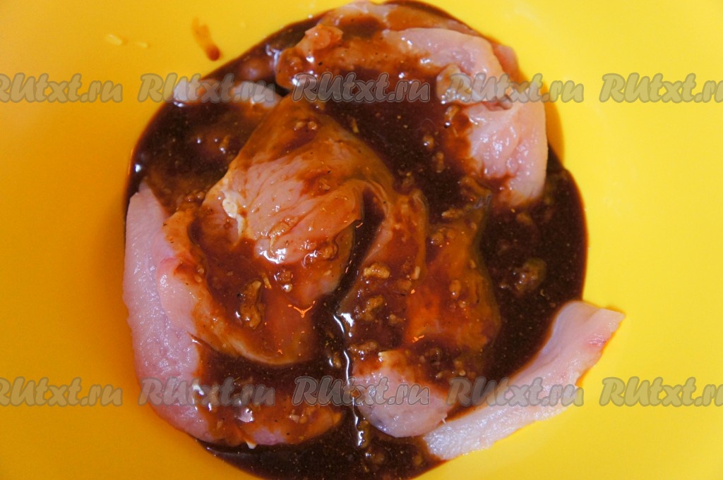 Маринад добавить к мясу, перемешать. Оставить мясо мариноваться на 10-15 минут.