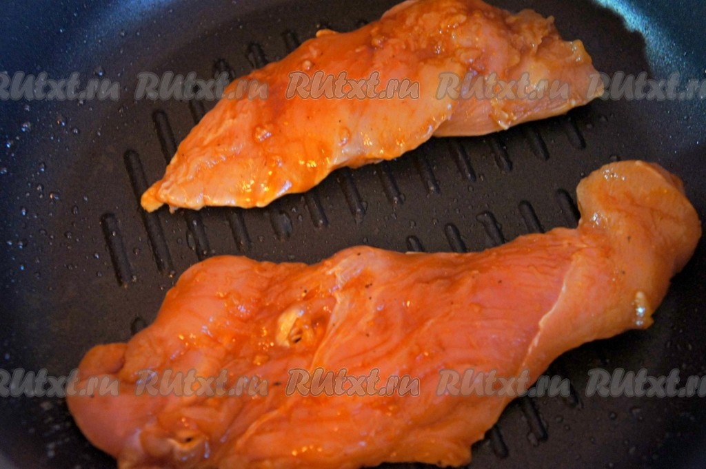 Гриль хорошо нагреть. Выложить на гриль мясо, обжарить с двух сторон до готовности. Степень готовности мяса зависит от толщины куска, готовить около 5-7 минут. Выложить мясо на бумажное полотенце, чтобы удалить излишки масла, произвольно нарезать мясо, когда оно немного остынет.