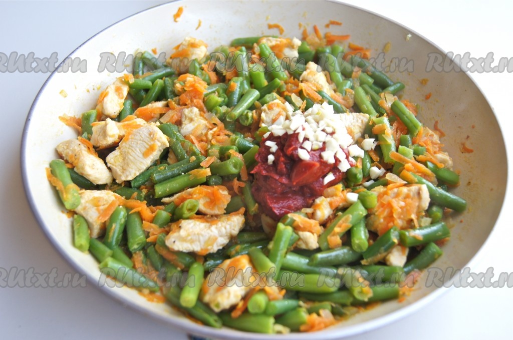Последний этап - томатная паста и рубленый чеснок. Все перемешала, минут 5 прогрела и стручковая фасоль с куриной грудкой готова.