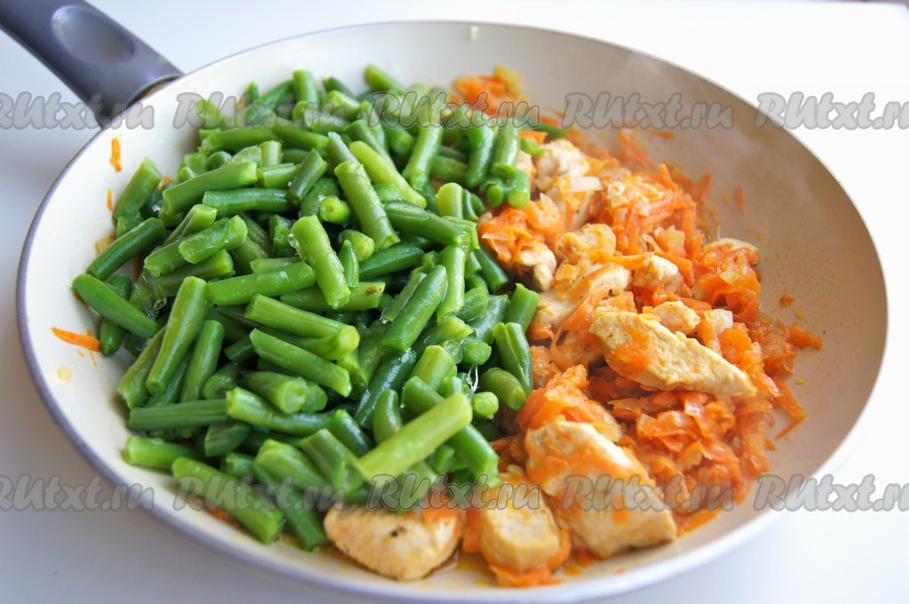 У стручковой фасоли отрезала кончики и нарезала на небольшие кусочки, отправила в сковородку к грудке, луку и морковке. Добавила 70-100 грамм воды, посолила, поперчила и накрыла крышкой. Тушила минут 15.
