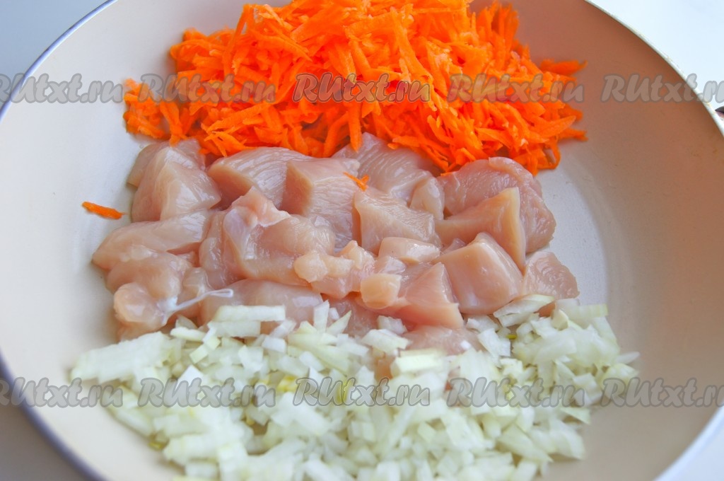Куриную грудку помыла и нарезала на средние кусочки. Морковь, лук очистила. Лук мелко порубила, а морковку натерла на терке. Куриную грудку, лук, морковь обжарила в небольшом количестве масла до готовности, примерно минут 10-15.