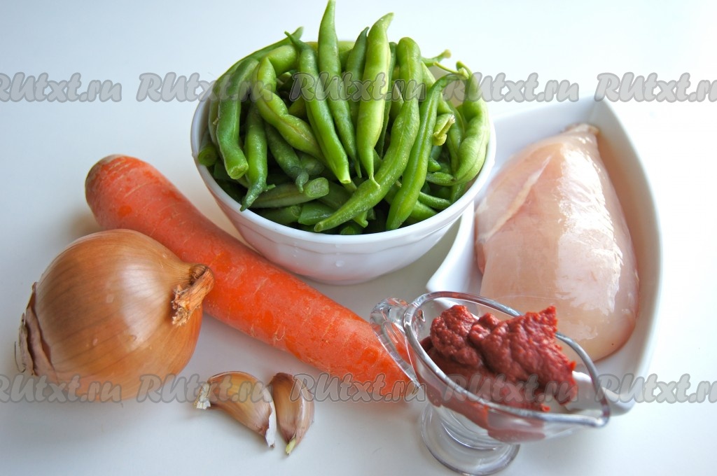 Подготовим все необходимые ингредиенты для приготовления стручковой фасоли с куриной грудкой в томате.
