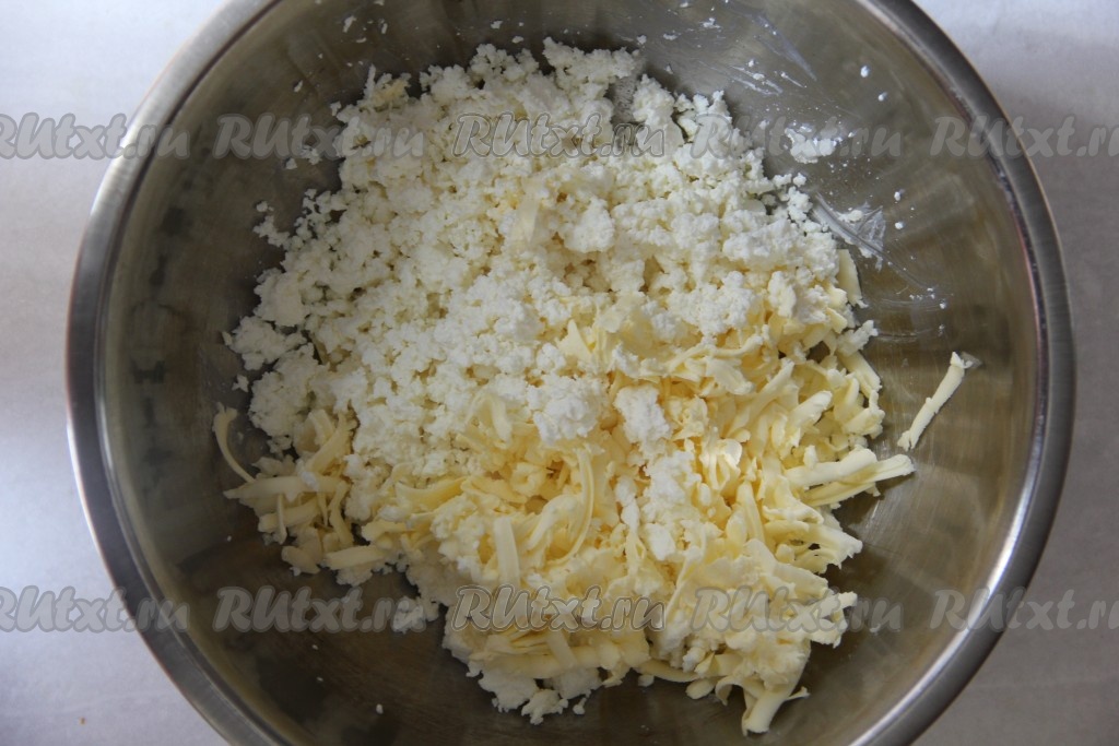 Сливочное масло натереть на терке и смешать с творогом.