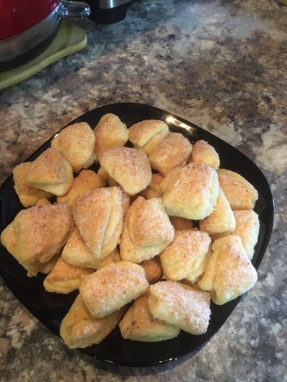 Теперь придадим нашему будущему печенью форму в виде треугольных конвертов. Для этого одну сторону круга обмакнуть в сахар. Сложить круг пополам, сахарной стороной вовнутрь. Далее обмакнуть опять одну строну в сахар и так же сложить тесто пополам, сахарной стороной вовнутрь. Полученный конвертик из творожного теста обмакнуть одной стороной в сахар и выложить на противень, застеленный пекарской бумагой, сахарной стороной кверху.