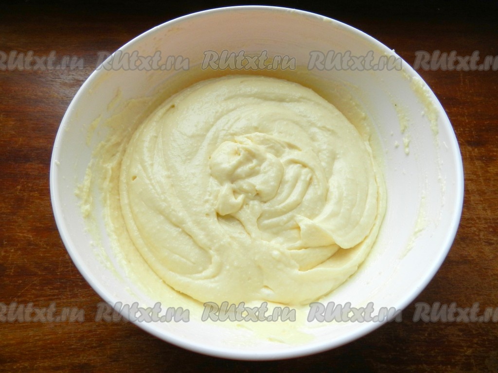 Муку смешать с разрыхлителем, всыпать в тесто, взбить, чтобы получилось пышное мягкое тесто.