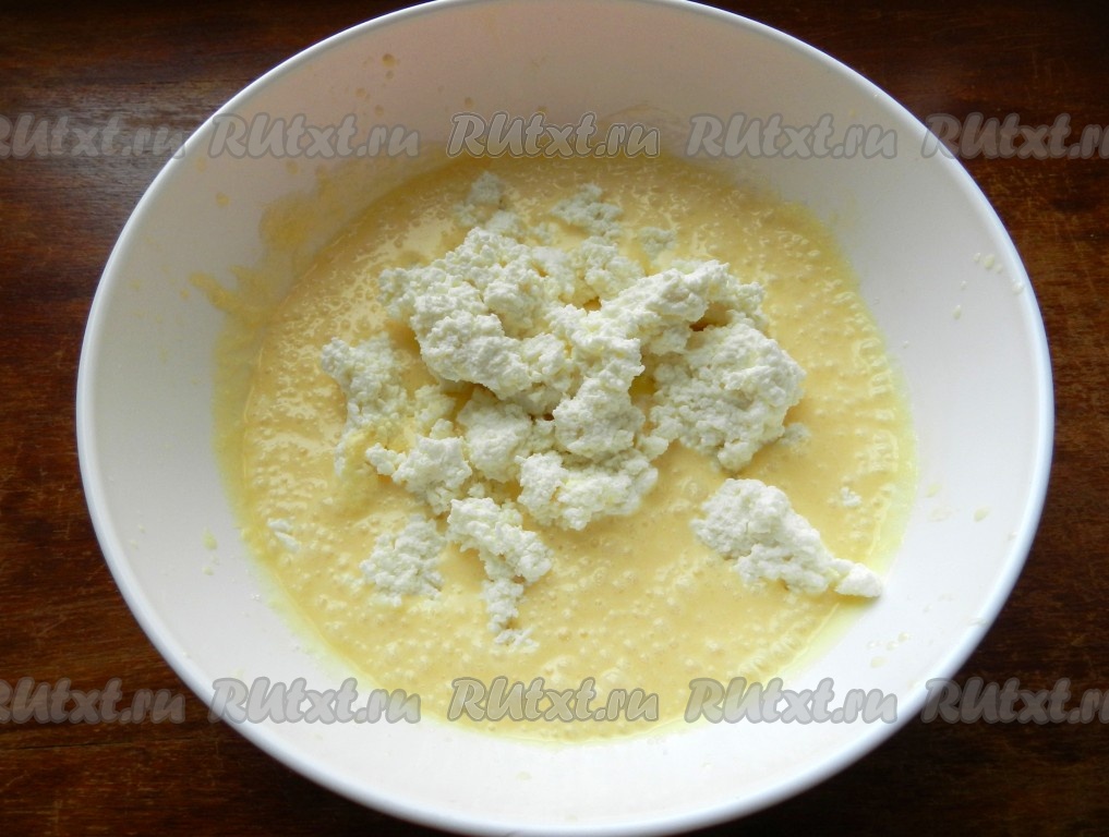Сливочное масло растереть с сахаром и ванильным сахаром, добавить яйца и взбить до однородной массы. Затем добавить творог и снова взбить, чтобы не было комочков.