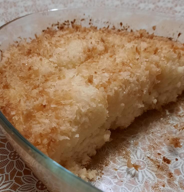 Горячий и готовый кокосовый кухен равномерно залить сливками.