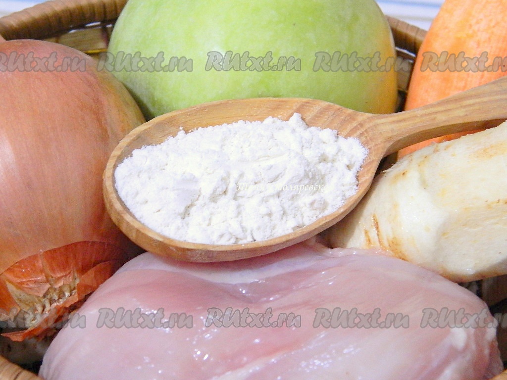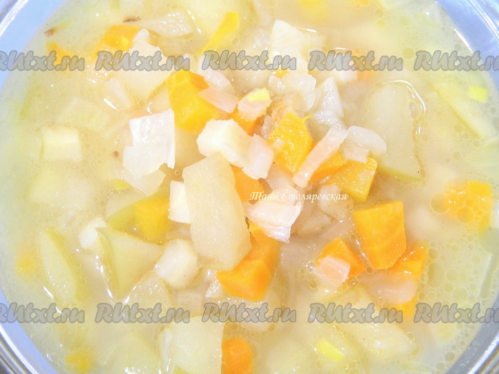 В кастрюле растапливаем сливочное масло. Высыпаем измельченные лук, корень петрушки, морковь. Слегка обжариваем. Заливаем бульоном и варим на медленном огне 30 минут. Добавляем яблоко и томим еще 15 минут.