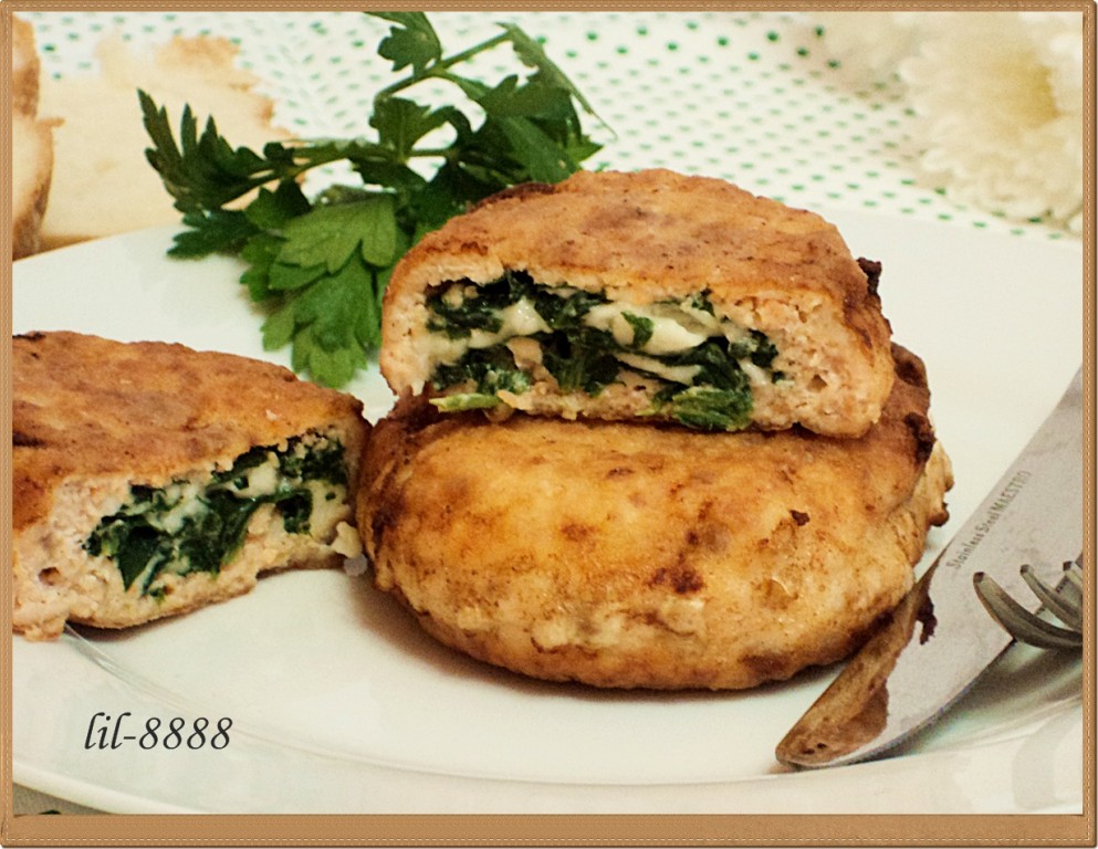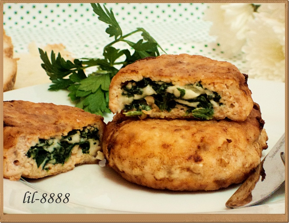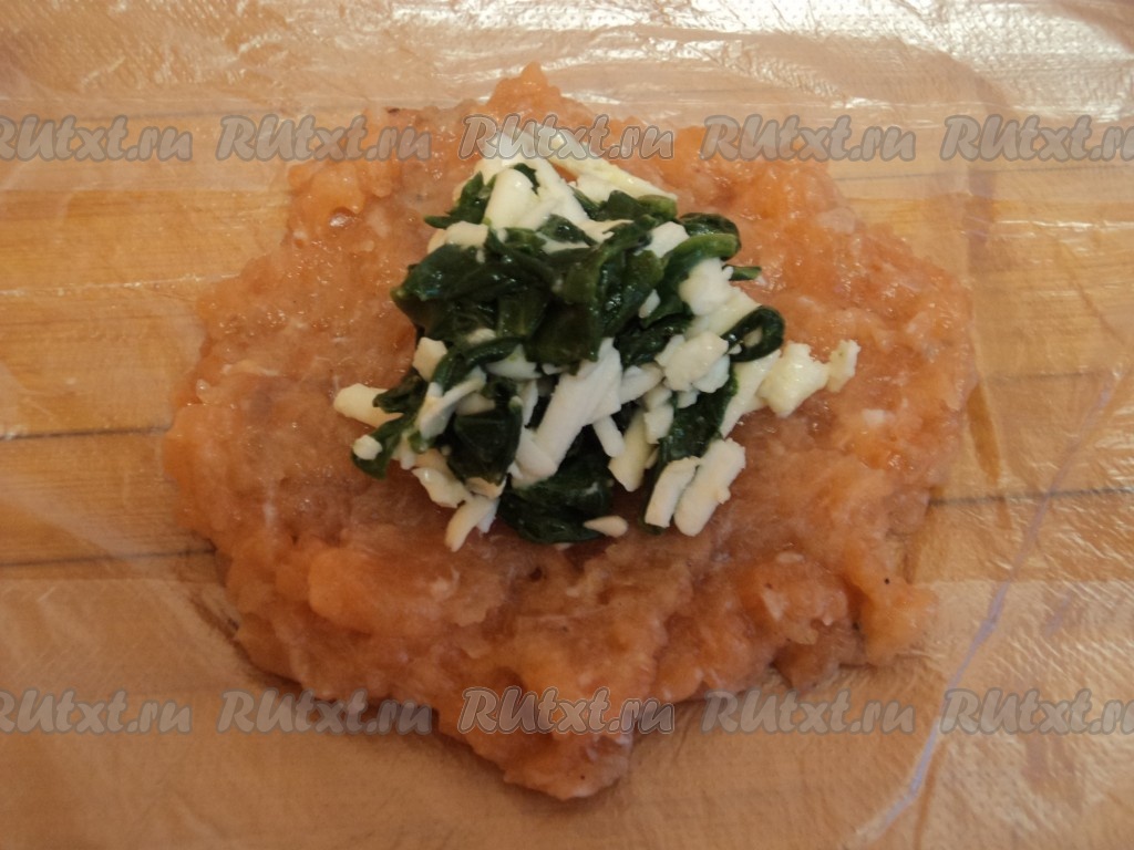 В середину положить 1 столовую ложку начинки из шпината и сыра, и при помощи пленки сформировать котлету.