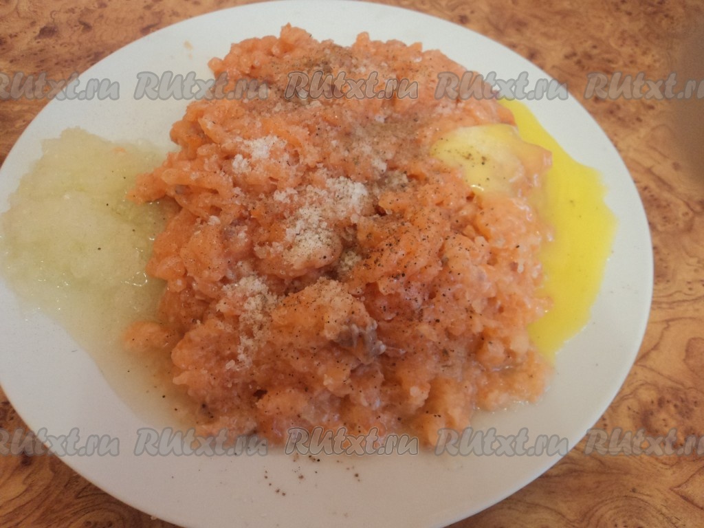 Фарш посолить, поперчить, добавить приправы и яйцо. Вымесить.