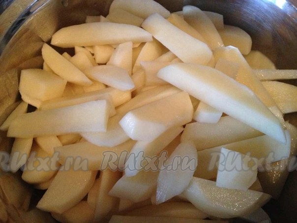 Затем нарезаем ломтиками картошку, кладем её в большую миску.