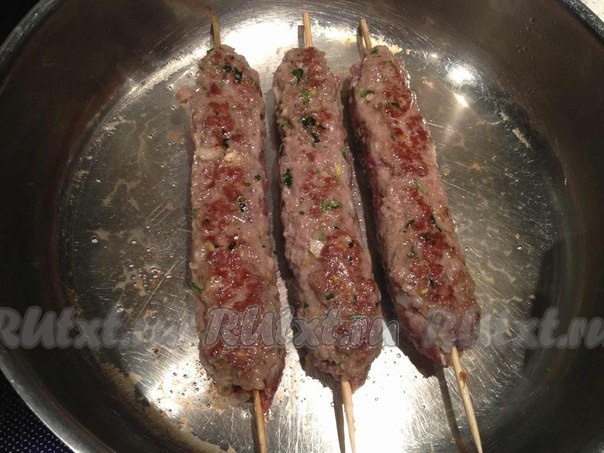 Теперь берем в руки фарш и с силой кидаем его о рабочую поверхность и так до тех пор, пока фарш не станет упругим и клейким (минут 10-15). Оборачиваем деревянные шпажки фаршем и жарим кебаб на среднем огне с 4 сторон до зарумянивания.