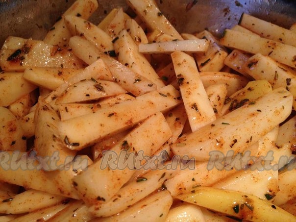Белки, чеснок и все специи отправляем к картошке, тщательно перемешиваем и отправляем в разогретую до 220 градусов духовку на 40 минут.