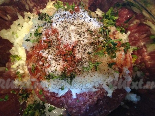 Далее готовим кебабы. К фаршу добавляем мелко нарубленный лук, чеснок, зелень, паприку, соль, перец и тщательно перемешиваем.