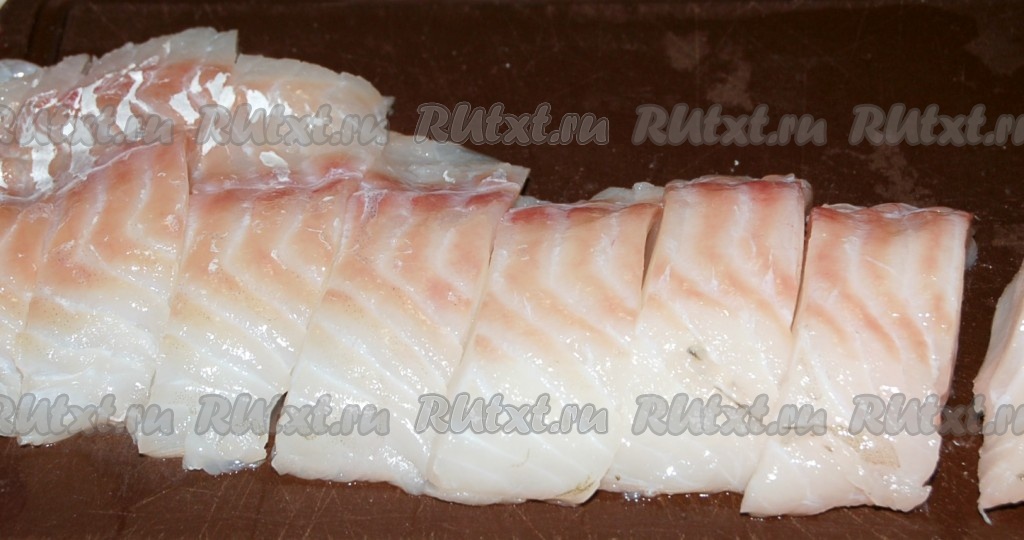 Треску разделать на филе или использовать готовое филе. Филе трески нарезать на кусочки.