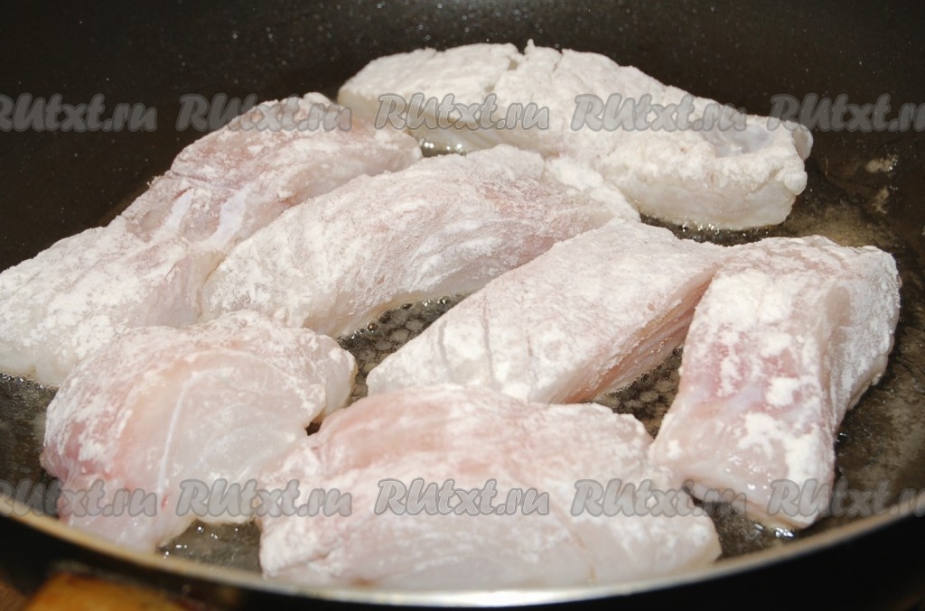 В сковороду налить растительное масло, раскалить его и в горячее масло укладывать кусочки трески в муке.