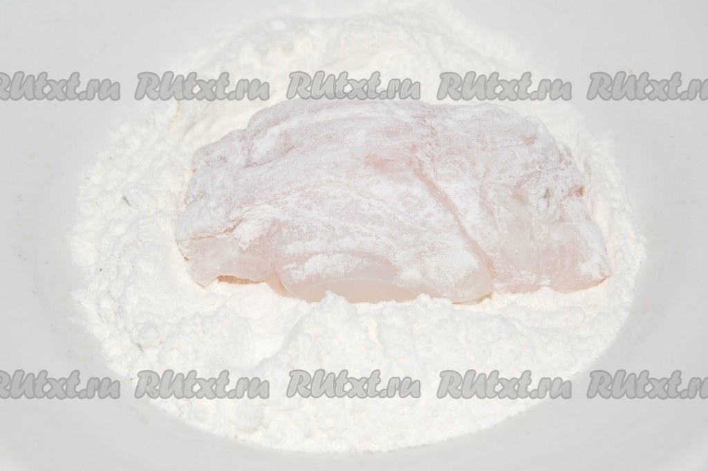 В тарелку насыпать муку и каждый кусочек филе трески обвалять в муке.