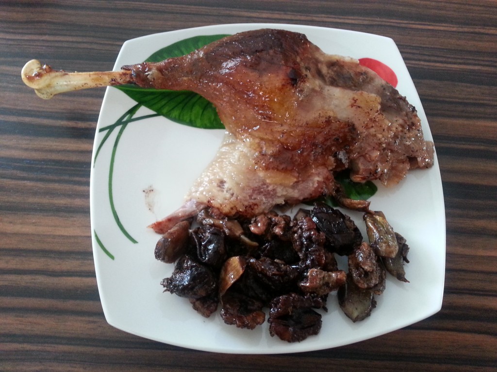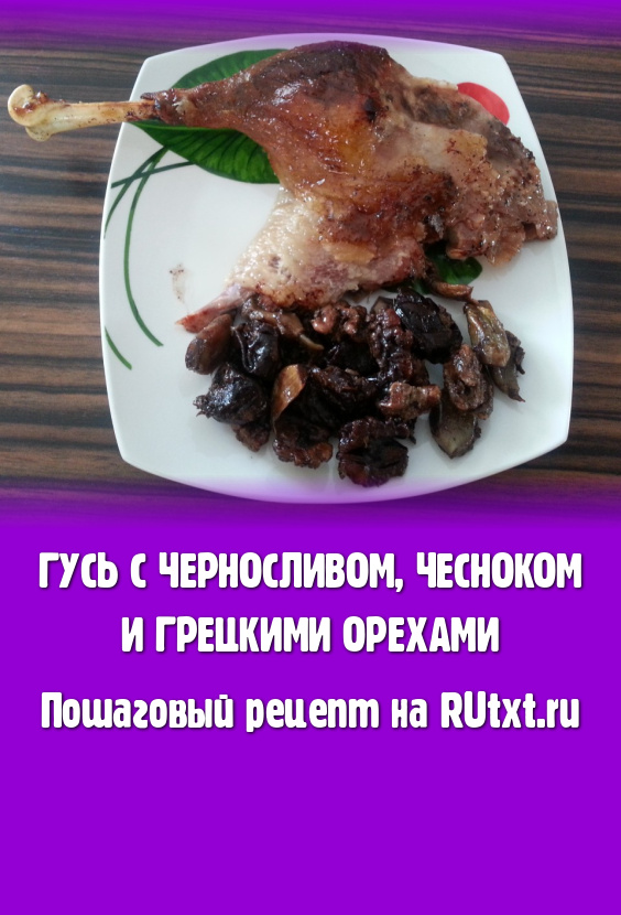 Вынуть готового гуся из духовки, разрезать на кусочки и подать вместе с черносливом, чесноком, грецкими орехами и яблоком.
