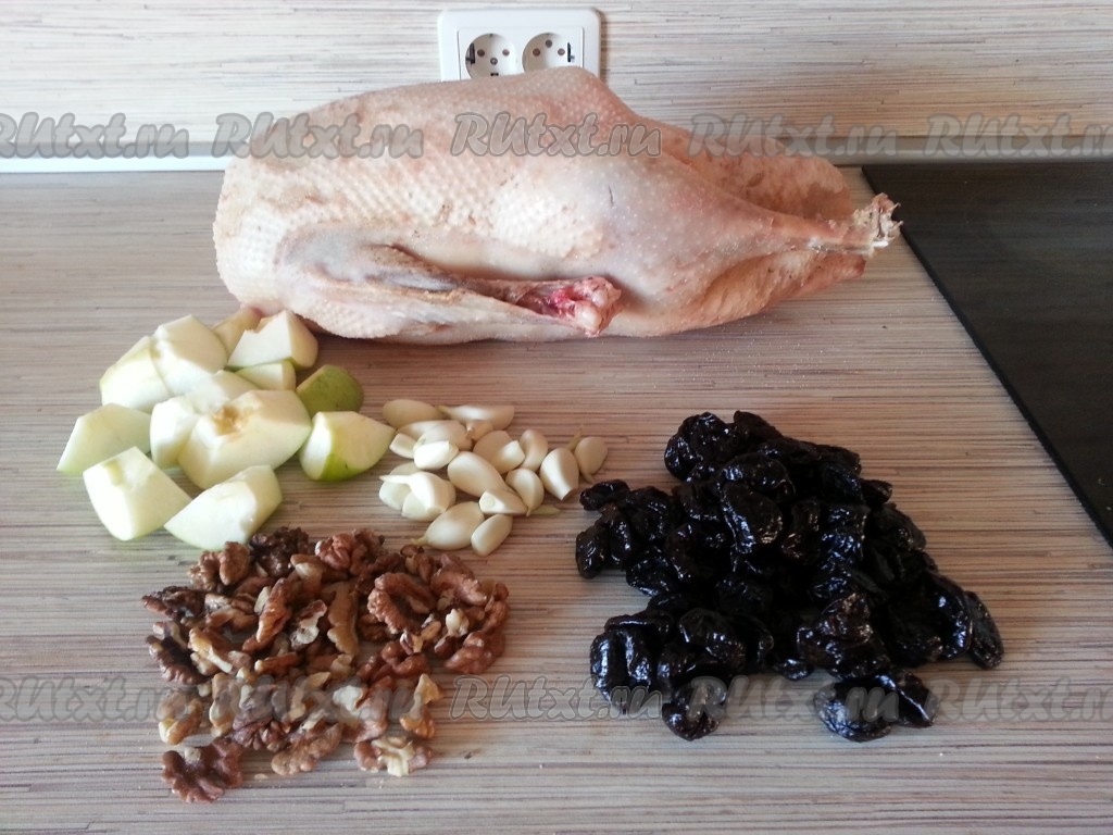 Приготовить начинку. Нарезать на дольки яблоки, промыть чернослив и ядра грецких орехов, чеснок очистить.