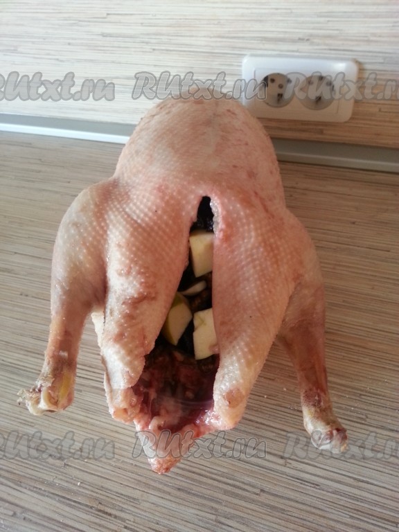 Внутрь гуся вложить плотно начинку и зашить. Можно начинку не солить.