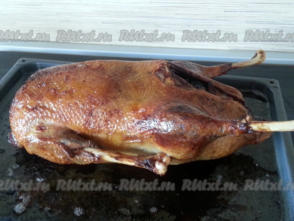 Развести мёд с горчицей, намазать гуся со всех сторон, положить на противень, духовку довести до 200 градусов, поставить в неё гуся ещё на 10-20 минут. Запекать до хрустящей корочки.