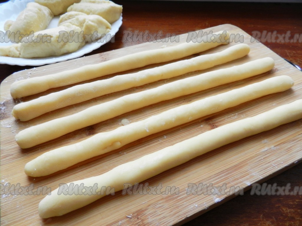 Тесто разделить на 12 частей. Из каждой части скатать жгутик толщиной около 1 сантиметра.