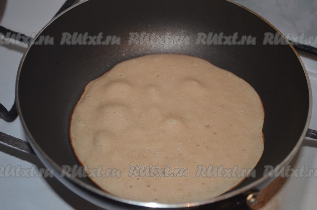 Разогреть сковороду, смазать её растительным маслом, выложить часть блинного теста, равномерно распределить. Жарить гречневый блин с двух сторон до румяности на среднем огне, затем переложить на тарелку.