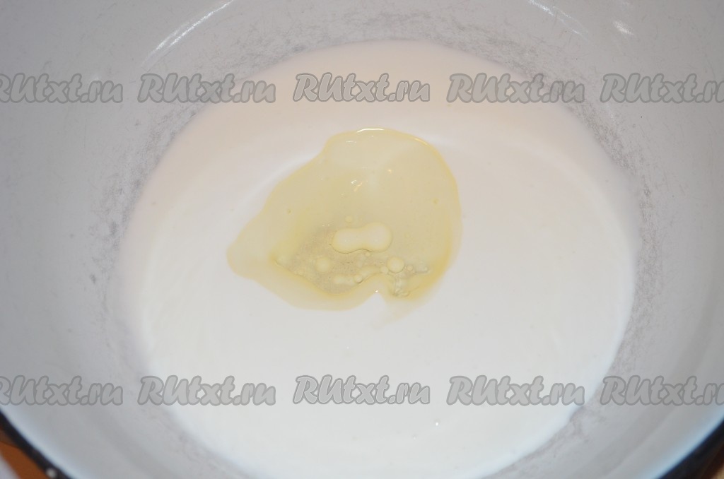 В миску влить кефир комнатной температуры (я подогреваю кефир до комнатной температуры в течение 20 секунд в микроволновке, но, если время позволяет, можно просто достать его заранее из холодильника), добавить 1 столовую ложку растительного масла, перемешать.