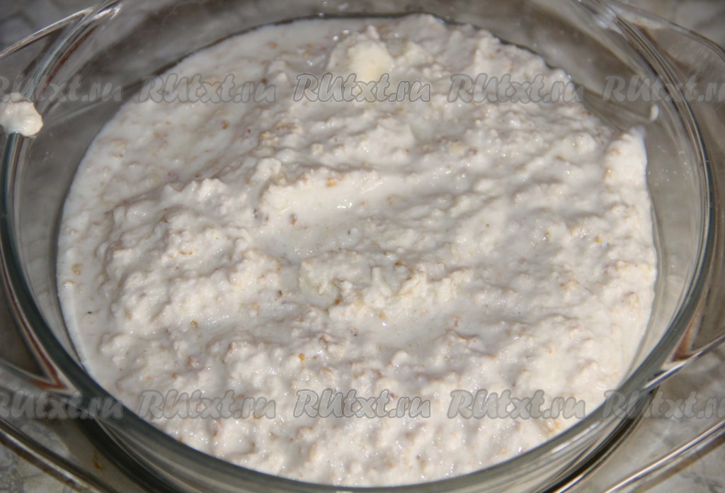 Манку и овсяные хлопья смешать, залить кефиром. Оставить на 2 часа для набухания овсянки и манки.