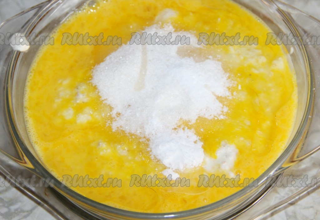 По истечении времени добавить взбитые яйца, сахар, соль, соду и растительное масло.