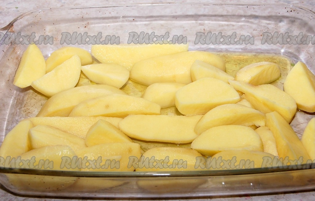 В форму для запекания налить растительное масло и выложить очищенный картофель, разрезанный на крупные дольки.