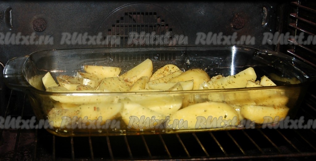 Отправить картофель в форме в заранее нагретую до 200 градусов духовку, примерно, на 35 минут. Готовность можно проверить, проколов запечённую картофельную дольку ножом (если нож легко входит в картошку, значит картофель готов и пора доставать его из духовки).