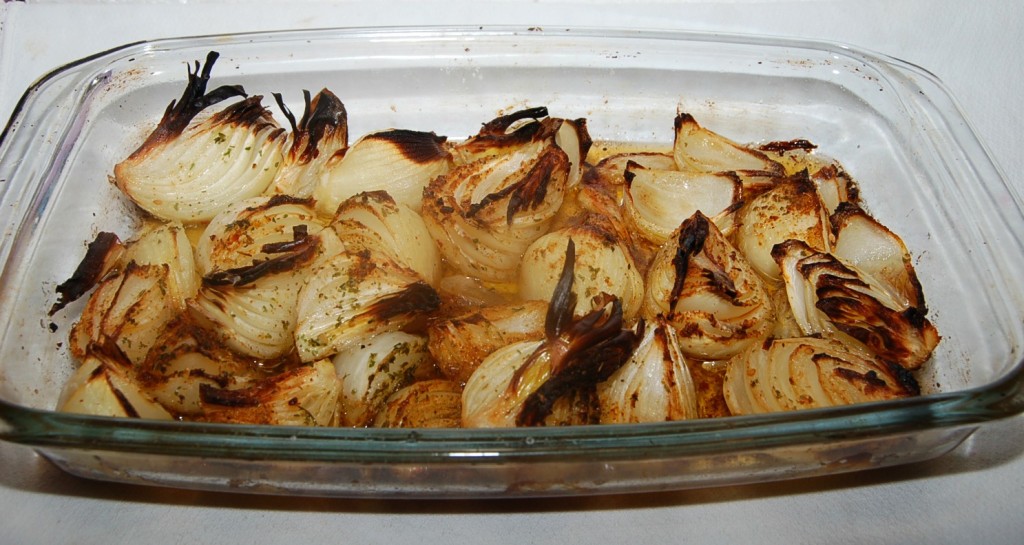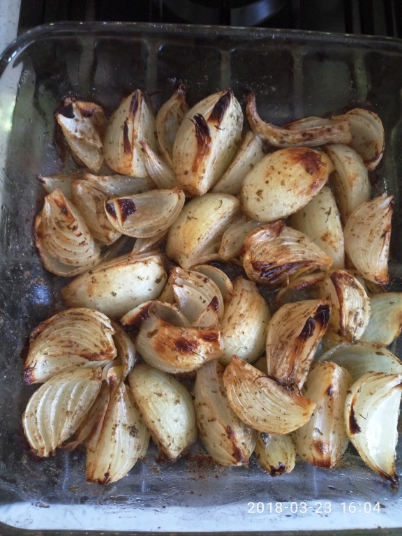 Когда лук будет готов, вытащить форму из духовки. Подавать запеченный лук на стол можно в этой же форме.