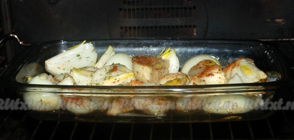 Лук репчатый очистить, нарезать крупными дольками и разместить в форме для запекания. Налить оливковое масло. Можно использовать любое другое растительное масло, но с оливковым вкуснее получится.