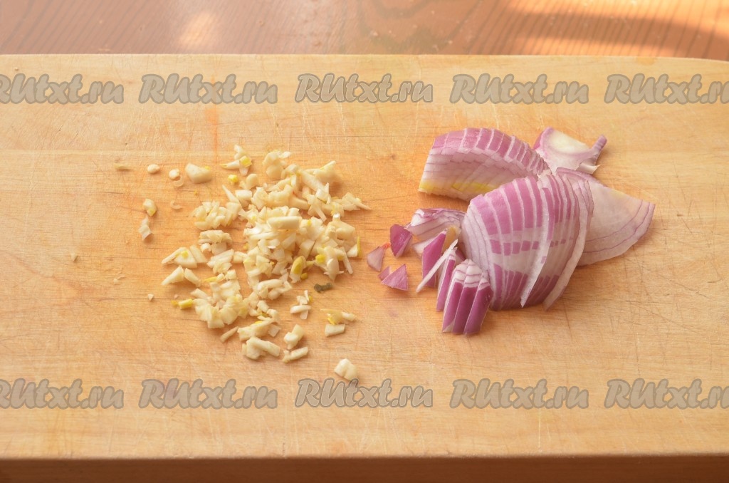 Измельчить лук и чеснок.