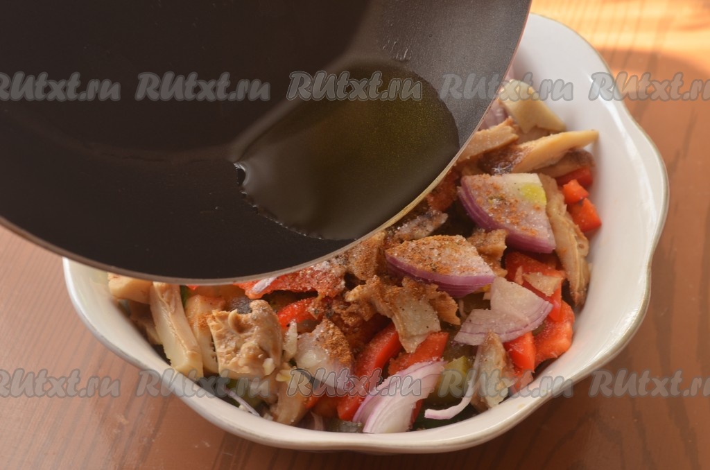 Растительное масло раскалить, полить салат, перемешать. Добавить лимонный сок, сахар, красный и черный перец. Дать салату настояться 20-30 минут.