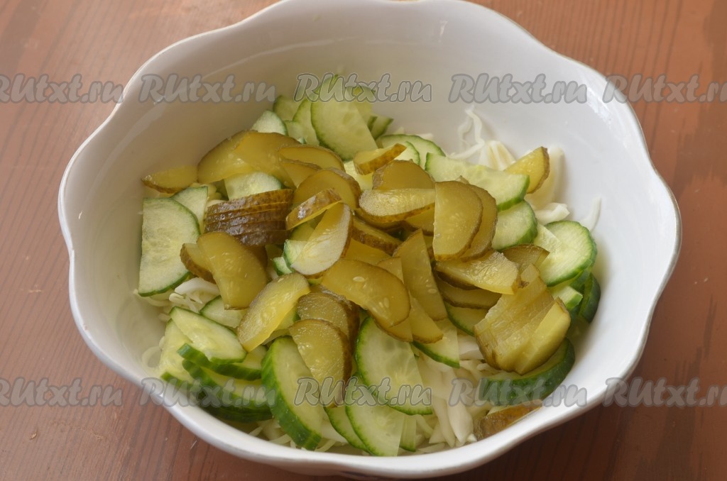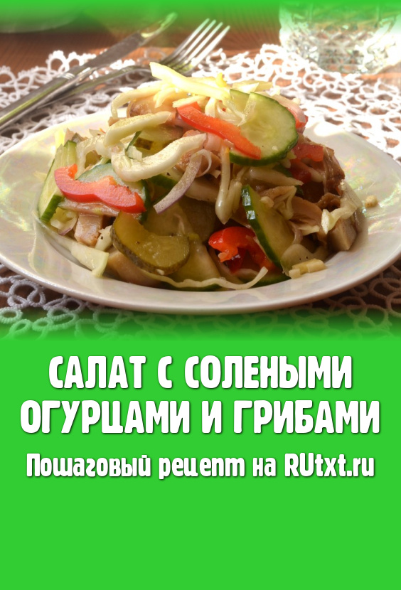 Пикантный, вкусный салат с солеными огурцами и грибами готов.